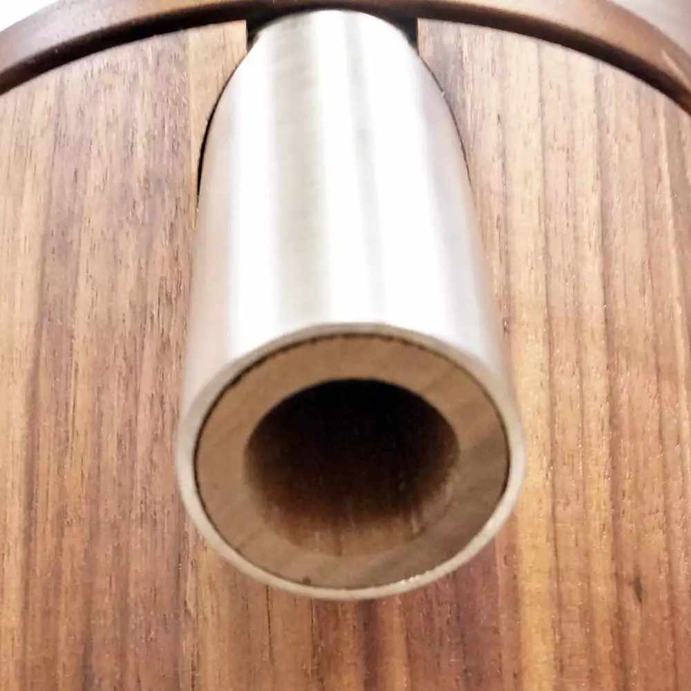 Weder mit dem für das Design der Getreidemühle ausschlaggebenden Edelstahlring noch mit dem Metall des Auslaufrohren (Innen komplett mit Holz ausgekleidet) kommt das gemahlende Mehl in Berührung.